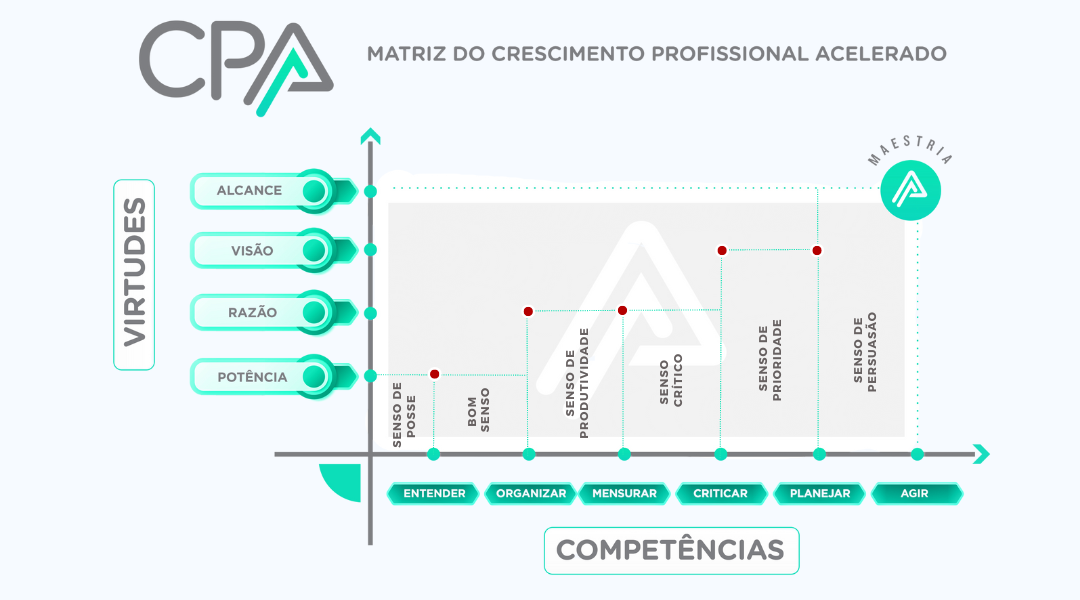Já no meio da matriz temos a combinação entre as competências técnicas e virtudes comportamentais: Senso de Posse, Bom Senso, Senso de Produtividade, Senso Crítico, Senso de Prioridade e Senso de Persuasão. Desenvolvendo o aluno em cada uma delas.
